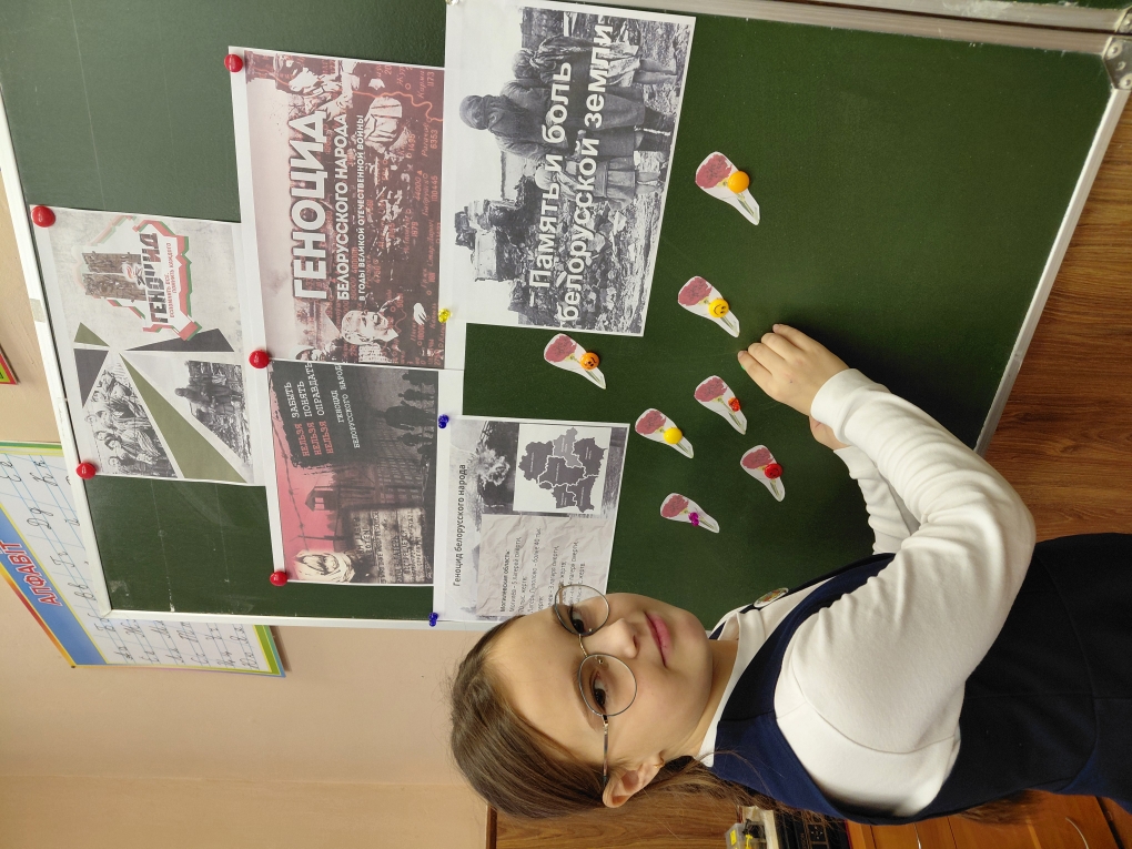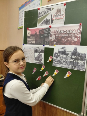 О трагических событиях Великой Отечественной войны, связанных с геноцидом белорусского народа вспоминали учащиеся 3 "Б" класса. Примеры Хатыни, Тростенца, Олы, Домачево вызвали чувства сострадания и гордости за подвиг белорусов. В дань уважения к памяти погибших и благодарности дети возложили цветы к символическому стенду.