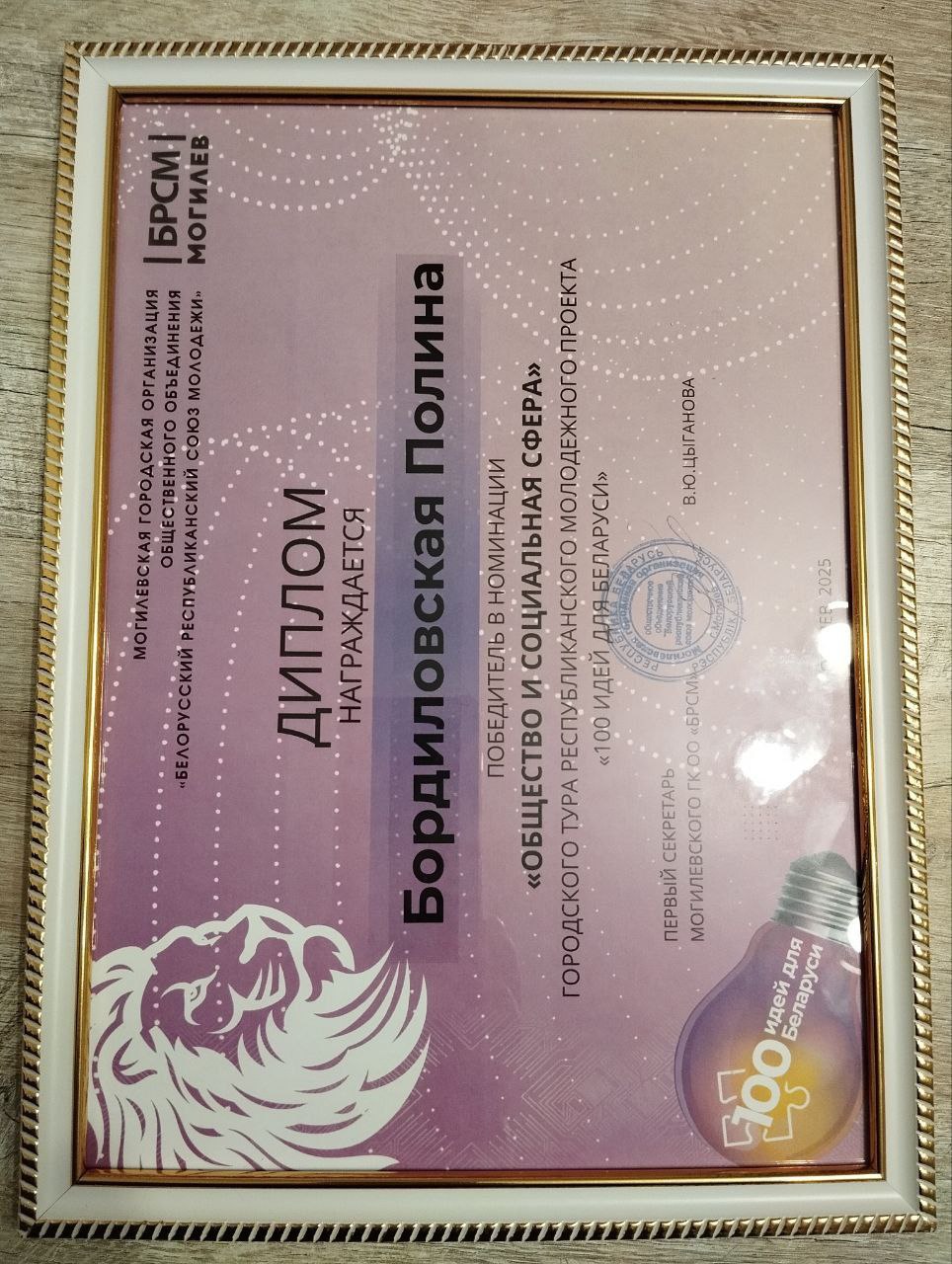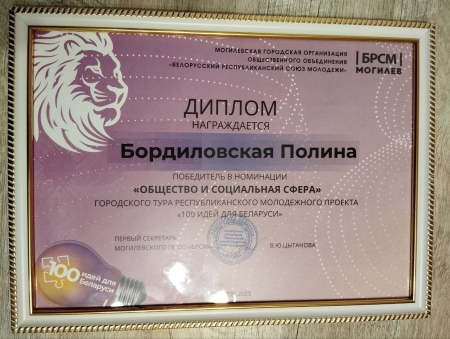 Поздравляем Полину Бордиловскую, ученицу 10 класса и её научного руководителя Екимова К.А., учителя информатики с победой на городском этапе республиканского молодежного проекта «100 идей для Беларуси»!