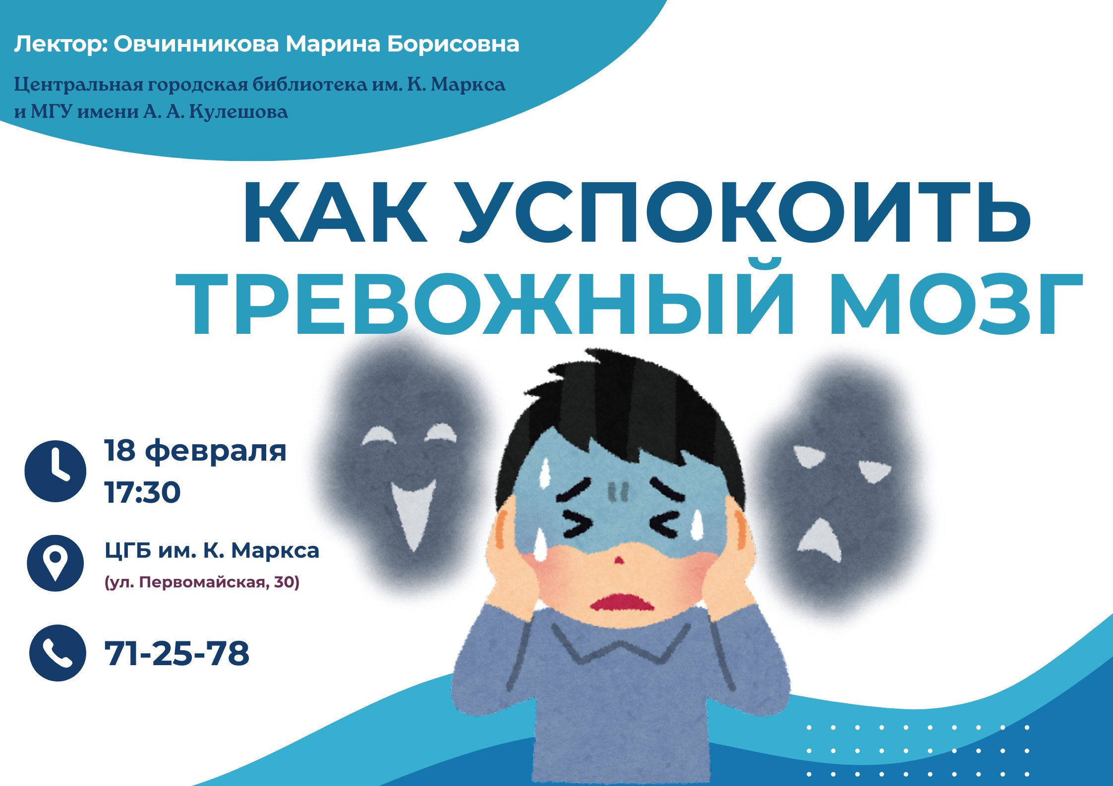 Центральная городская библиотека им. К. Маркса продолжает цикл очных встреч с преподавателями психологии из МГУ имени А.А. Кулешова. Очередная встреча Открытого психологического лектория состоится 18 февраля в 17.30 на тему «Как успокоить тревожный мозг».